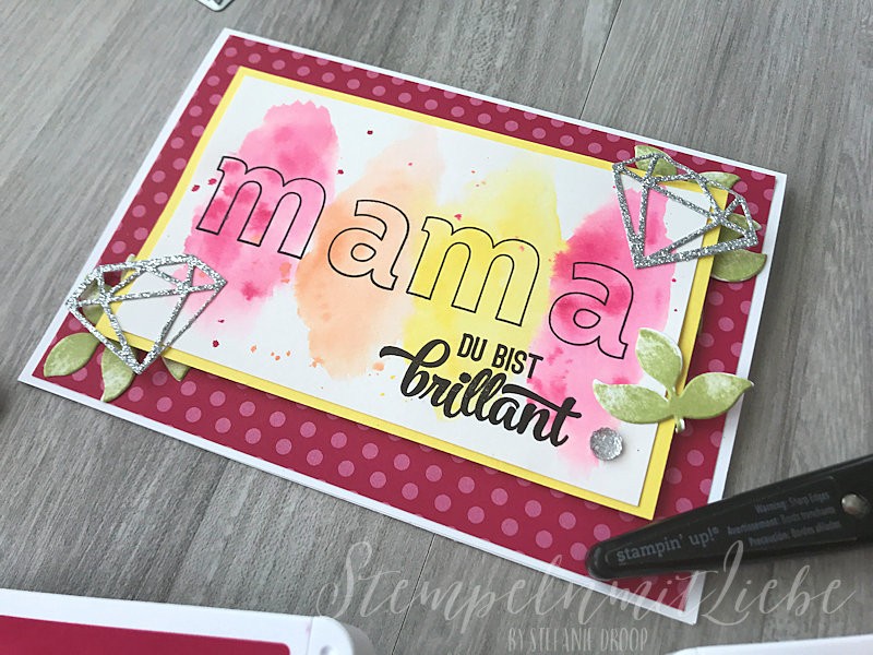 Dann habe ich noch ein paar Diamanten untergebracht, denn den Spruch „Du bist brillant“ fand ich einfach passend und befindet sich in dem Stempelset Tasche voller Sonnenschein.